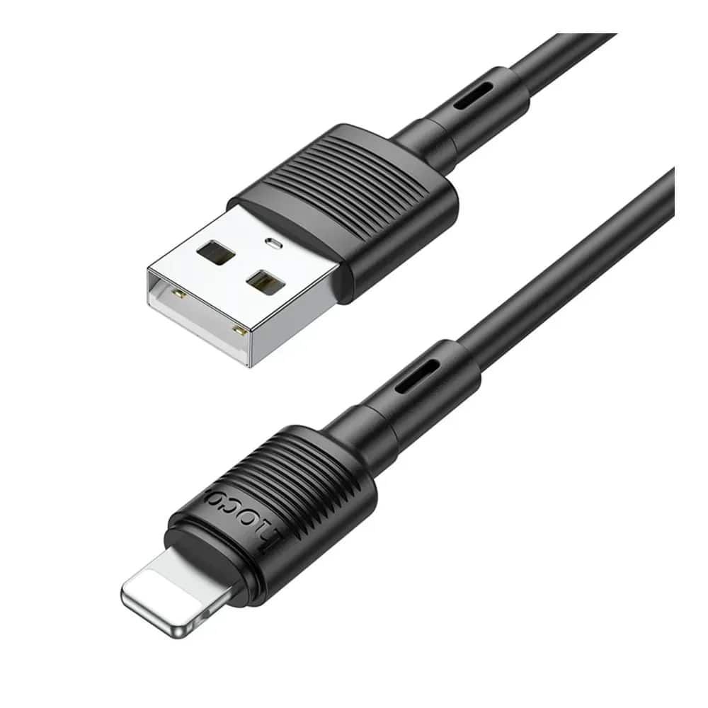 Кабель USB Hoco X83 Lightning – це надійний кабель для безпечного заряджання iPhone, iPad та інших сумісних гаджетів, що виробляються корпорацією Apple. Модель реалізована в стильному, ергономічному дизайні, що забезпечує комфортну повсякденну експлуатацію, пропонується у двох класичних кольорах: у чорному та білому кольорах. Корпуси конекторів виконані у зручній формі із заокругленими гранями, мають ребристу поверхню, що перешкоджає ковзанню пальців. Місця їх з’єднання з кабелем виконані з додатковим захистом від зламів, що значно продовжує термін служби аксесуарів. Обплетення кабелю, як і корпусу роз’ємів, виготовлено з полівінілхлориду, який перешкоджає його сплутуванню, розтягуванню та розриву. Чотирьохжильний сердечник із чистої міді складається з 72 провідників, гарантує стабільність процесу зарядки та швидкості передачі даних. Встановлення з’єднання між пристроями здійснюється через USB-Lightning. Максимальна сила струму становить 2.4А. Довжина кабелю – 1м.
