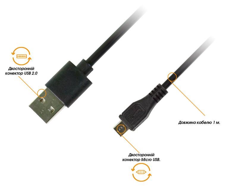 Реверсивний MicroUSB кабель Piko для з"єднання мобільних телефонів, смартфонів, портативних MP3-плеєрів, цифрових фото та відеокамер із комп’ютером або зарядним пристроєм. Обидва його конектори можна під"єднати будь-якою стороною.