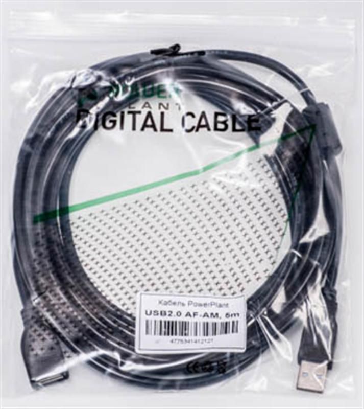 Кабель PowerPlant (KD00AS1212) USB2.0(AF)-USB2.0(AM), 5м, One ferrite, Black