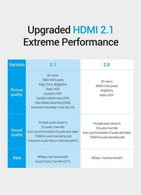 Кабель останнього покоління Vention HDMI 2.1 (AAL) має 3-х кратне збільшення пропускної здатності до 48 Гбіт/с (щодо кабелів стандарту HDMI 2.0 з пропускною здатністю до 18 Гбіт/с), підтримкою роздільної здатності 8K (7680х4320) Ultra HD, технології оновлення (VRR), динамічного HDR та автоматичного регулювання латентності.