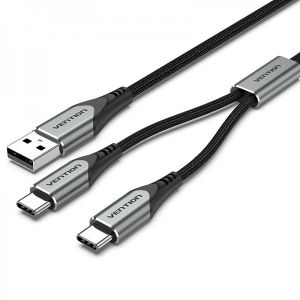 Кабель 2 в 1 USB-Type-C Vention Nylon 2.4А 480Mbps nickel-plated - підтримка одночасної зарядки двох пристроїв з інтерфейсом Type-C.