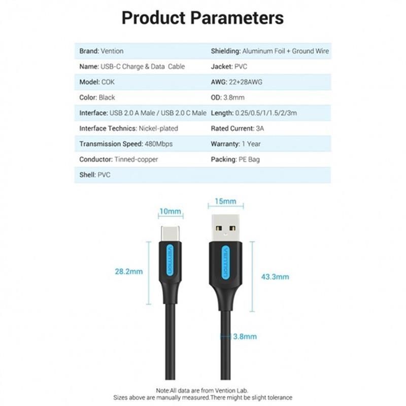 Зовнішній інтерфейсний кабель Vention USB Type-C - USB призначений для синхронізації, передачі даних, а також зарядки периферійних (мобільних) пристроїв і їх компонентів з роз"ємом USB Type C і USB.