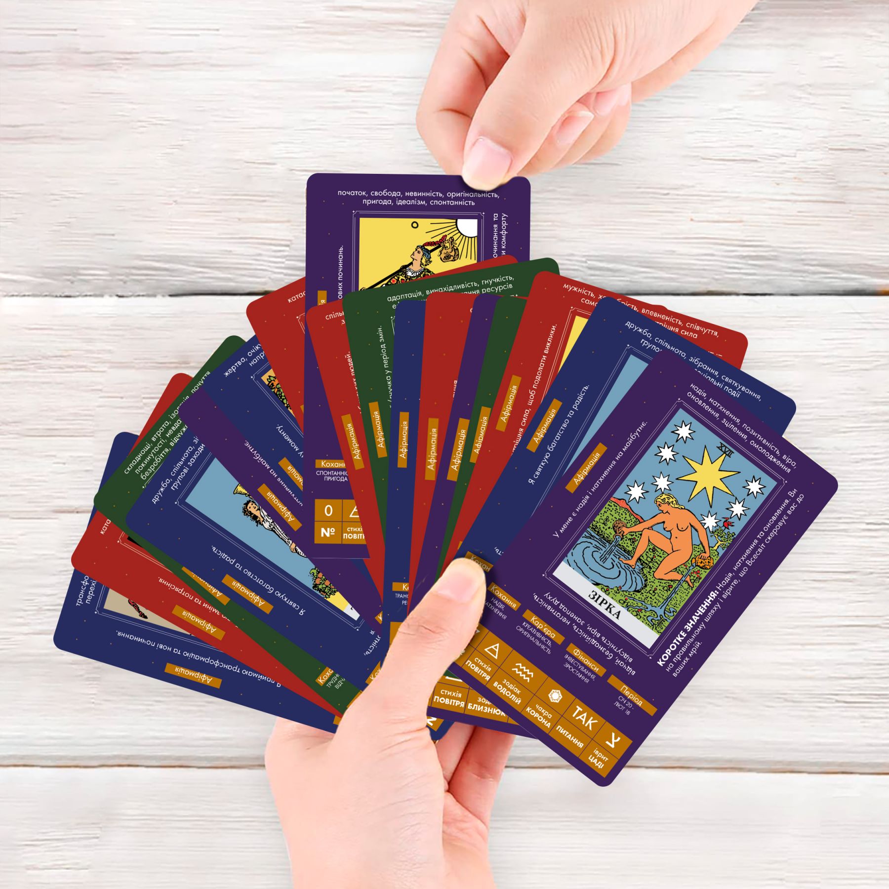 На картах також вказані афірмації, пряме та перевернуте значення карти та її значення у різних сферах життя