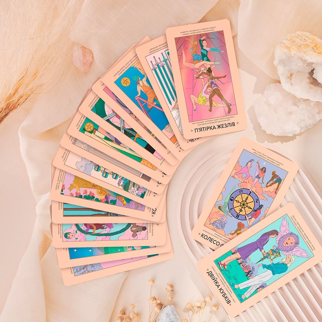 У цій колоді таро зібрані всі незалежні прояви жінок: від форм тіла до ремесла занять, від улюбленого хобі до домашніх справ, від малого до дорослого віку.