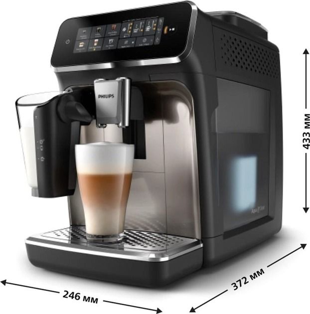 Комплектація:кавомашина, фільтр AquaClean, кришка для зберігання LatteGo, тюбик з мастилом, мірна ложка, одноразовий тест жорсткості води, молочна система LatteGo