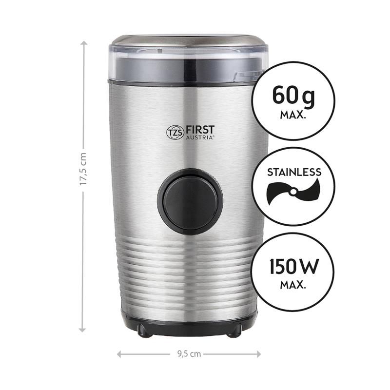 За допомогою цієї практичної машини можна швидко та легко подрібнити та подрібнити кавові зерна, а також зерна, трави чи горіхи. Чи хочете ви випити свіжомелений еспресо або дрібно нарізати горіхи: кавомолка працює на потужному, повністю автоматичному рівні потужності 150 Вт і керується за допомогою ручки керування. Два міцні леза з нержавіючої сталі завжди гарантують точний результат. Компактний розмір та сучасний дизайн кухонного помічника дозволяють легко зберігати його на кухні. Цей подрібнювач багатофункціональний!