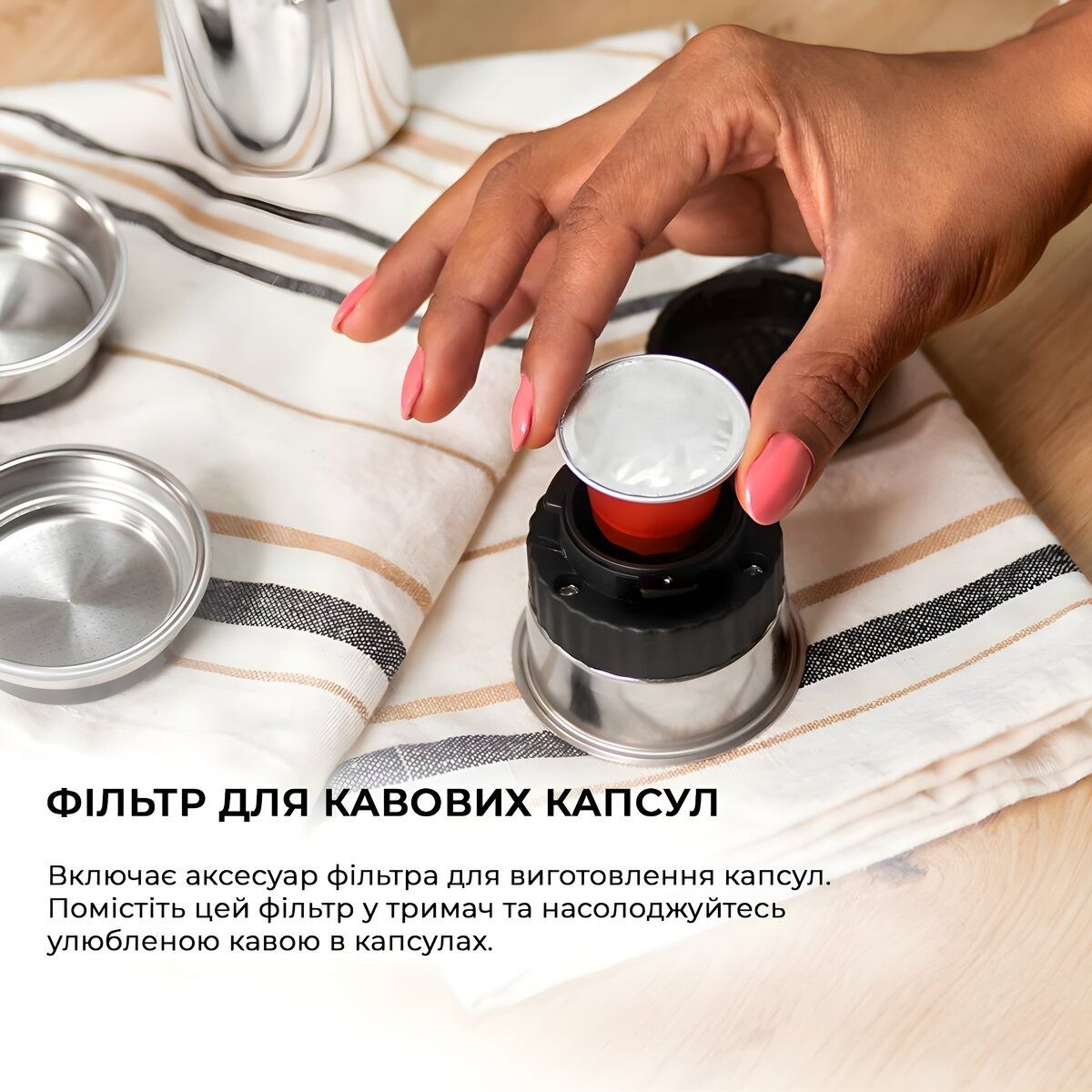 Включає фільтр виготовлення алюмінієвих капсул. Помістіть цей фільтр у тримач фільтра та насолоджуйтесь улюбленою кавою.