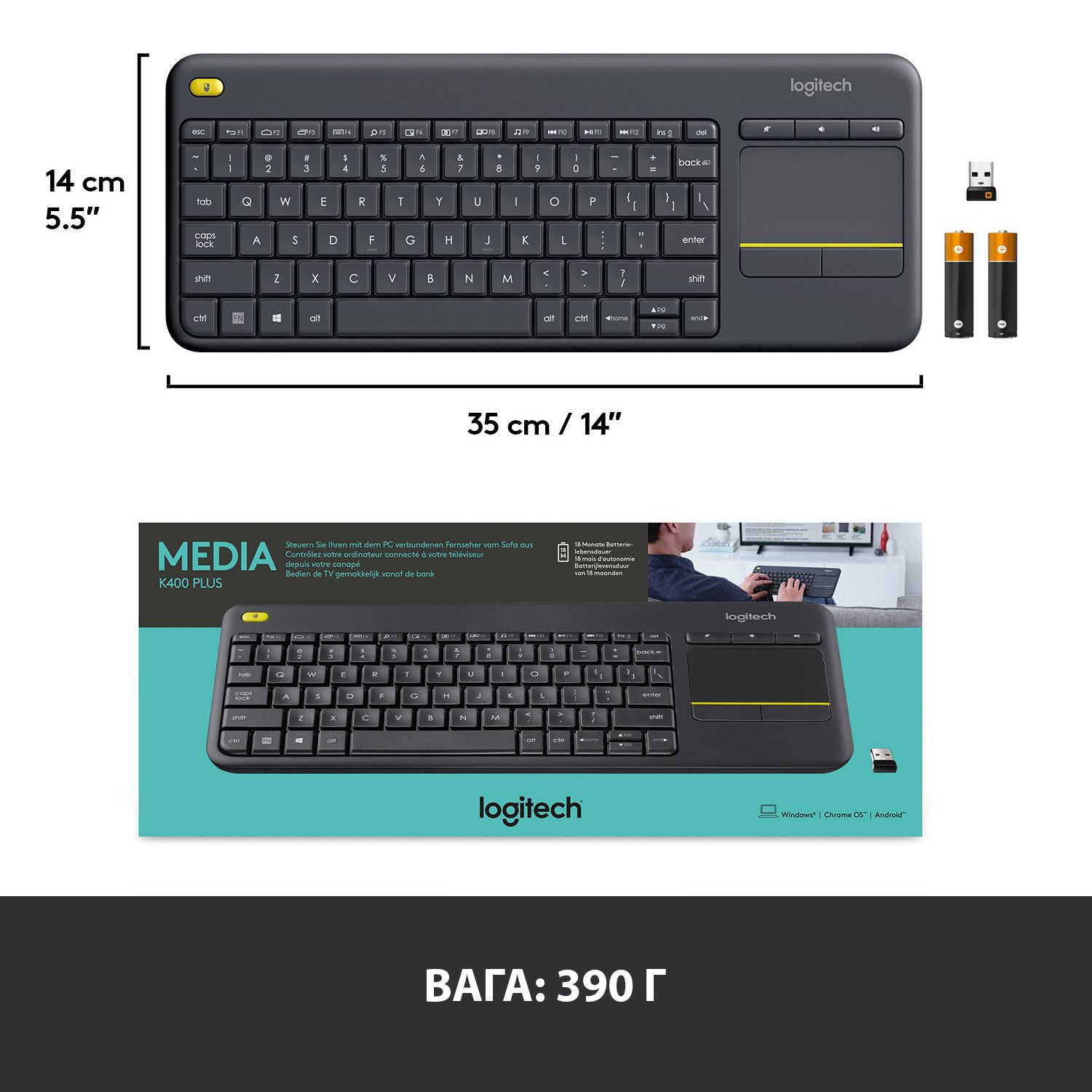 Клавіатура K400 Plus забезпечує неперевершену зручність. Розкладка спеціально розроблена для комфортного перемикання між мультимедійними пристроями.