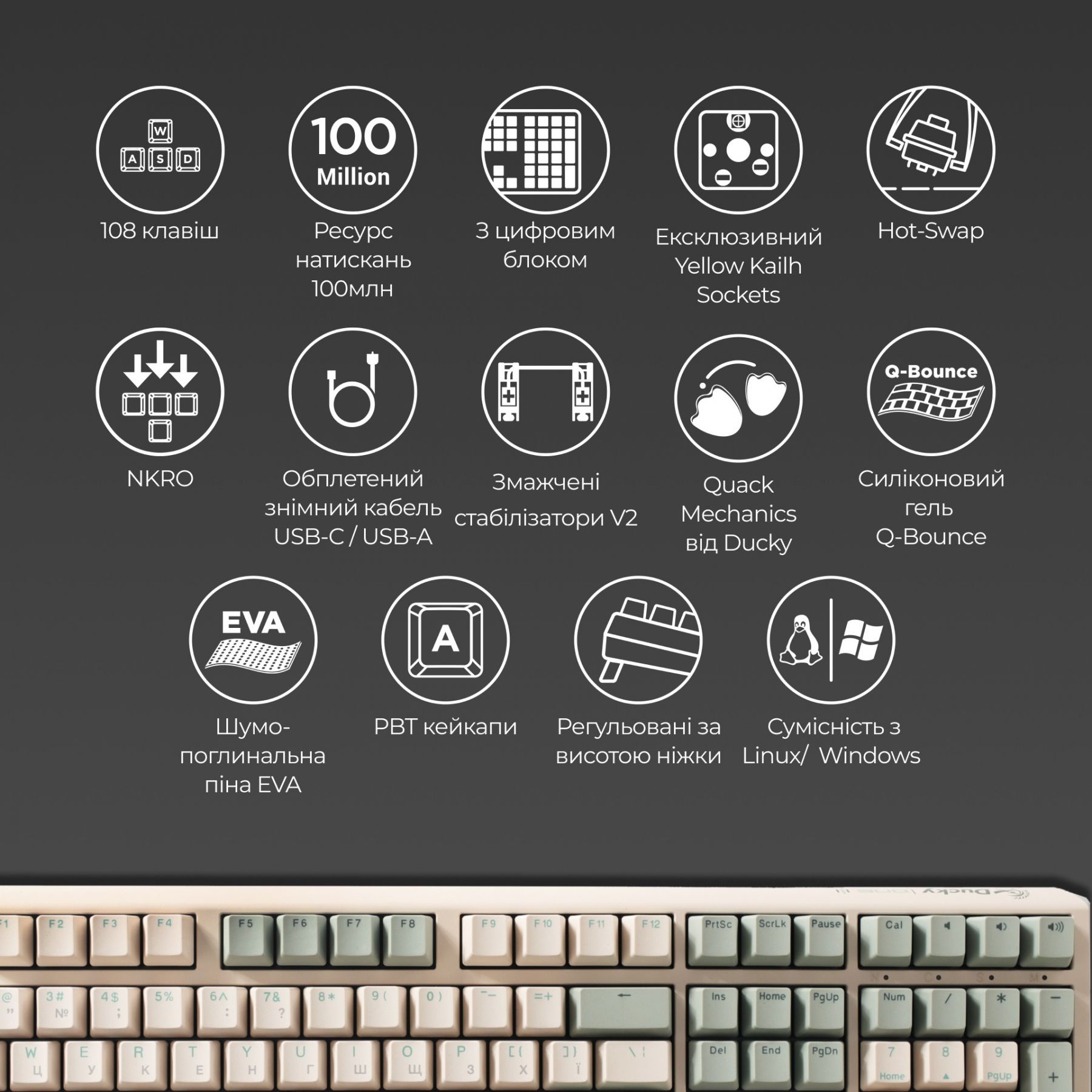 - Дизайн: Клавіатура створена згідно з філософією Ducky «QUACK» Mechanics, що поєднує естетику, функціональність і надійність, а також враховує приємну акустику.