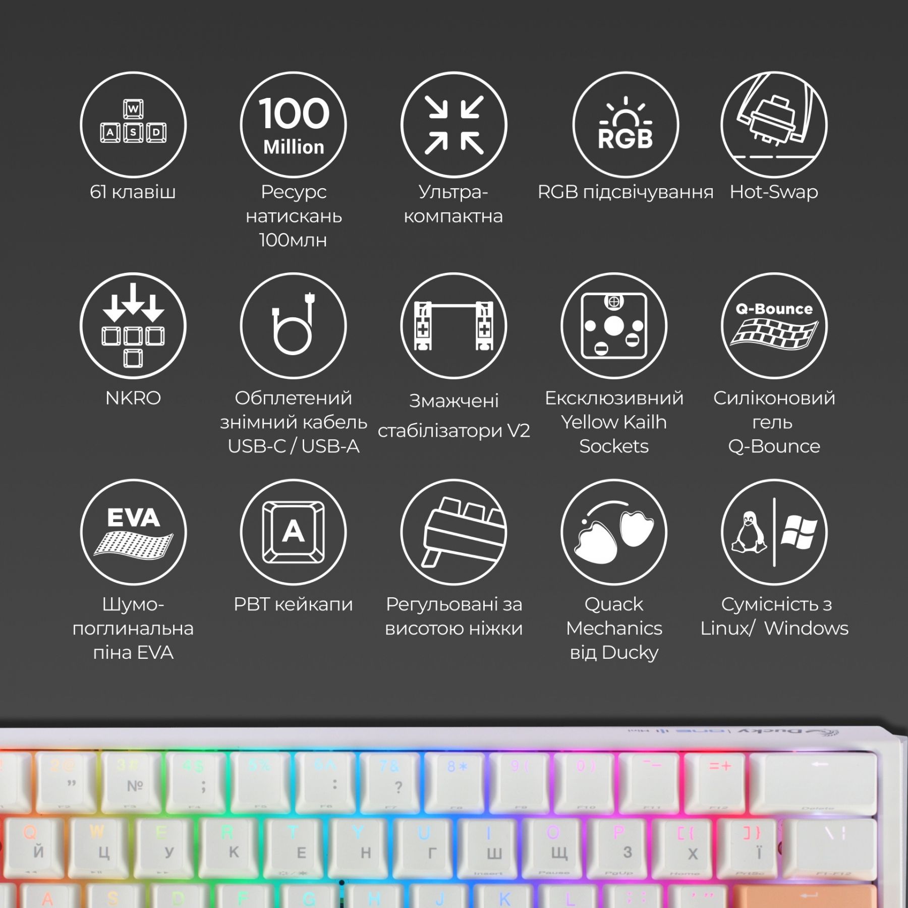 - Дизайн: Клавіатура створена згідно з філософією Ducky «QUACK» Mechanics, що поєднує естетику, функціональність і надійність, а також враховує приємну акустику.