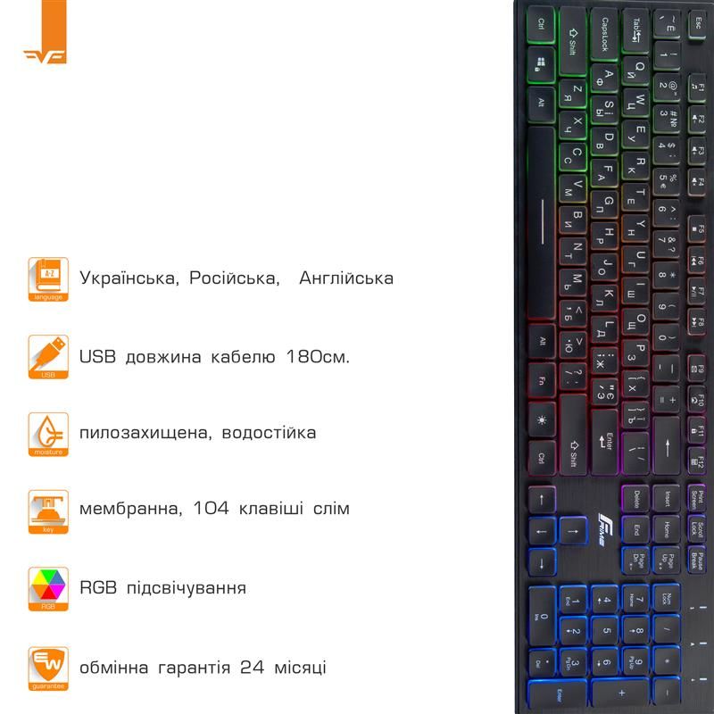 Frime Moonfox3Color - клавіатура, яка має масу переваг і корисних функцій. Вона виконана з якісного пластику в чорному кольорі, в класичному дизайні, є досить компактною. Її головна особливість - Rainbow підсвічування клавіш з настроюваної яскравістю (3 рівня яскравості), яка полегшить роботу за рахунок світіння кожної літери. Також у неї є 12 клавіш з додатковою функцією при натисканні FN і кабель 180 см. Клавіатура оснащена 104 клавішами на мембранних перемикачах. Сумісна з Windows, Mac OS, Linux - з переважною більшістю застосовуваних операційних систем. Має підтримку англійської, української та російської розкладки клавіатури. Підключення до комп’ютера здійснюється через USB роз’єм.