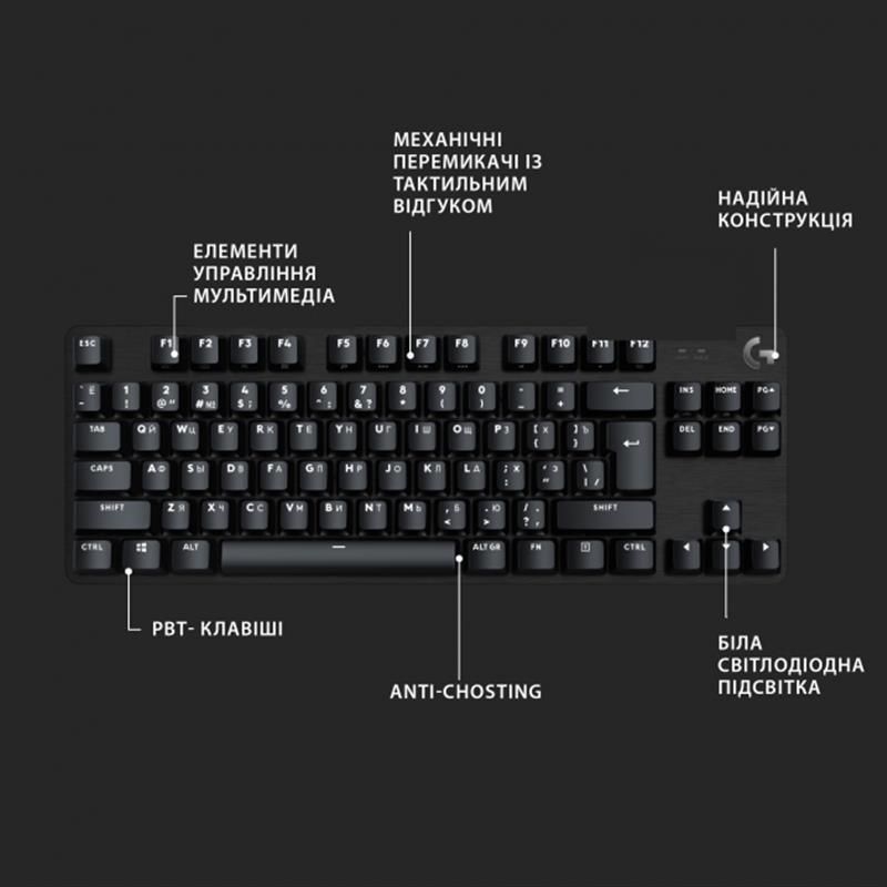 G413 TKL SE відрізняється розкладкою без цифрового блоку та неперевершеною продуктивністю. Механічні перемикачі ігрового класу з тактильним відгуком забезпечують точну та швидку зворотний зв’язок у момент спрацьовування, що важливо у змаганнях та іграх-шутерах від першої особи, де часто потрібно діяти блискавично.
