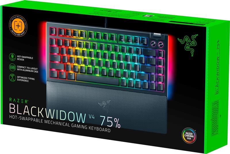 Razer BlackWidow V4 75% — це компактна механічна клавіатура з можливістю «гарячої» заміни перемикачів і підсвічуванням Razer Chroma RGB, яка доведеться вчасно ентузіастам, що шукають ширші можливості індивідуального налаштування та занурення. Від встановлення нових перемикачів до створення унікальних світлових ефектів — тепер ви можете визначити, як виглядатиме ваша улюблена ігрова клавіатура.