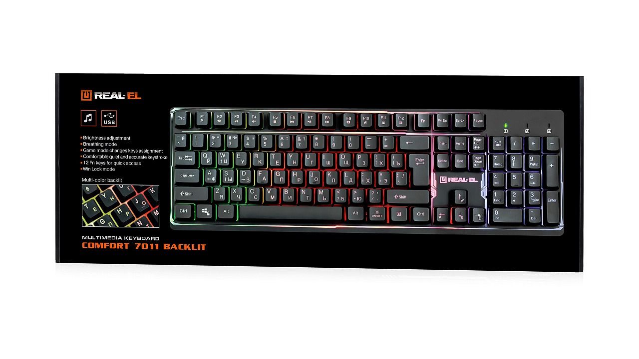 Особливістю мультимедійної клавіатури REAL-EL Comfort 7011 Backlit є кольорове підсвічування з регулюванням рівня яскравості, функція блокування клавіші Win Lock, яку зручно використовувати в іграх, комфортний тихий і чіткий хід клавіш.