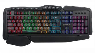 Особливістю ігрової клавіатури REAL-EL Gaming 8900 RGB Macro є: ергономічний ігровий дизайн, 18 настроюваних макросів, NKRO (26 клавіш без фіктивних спрацьовувань), звукове реагування підсвічування, 12 Fn кнопок швидкого доступу до Windows, Інтернету і Мультимедіа.