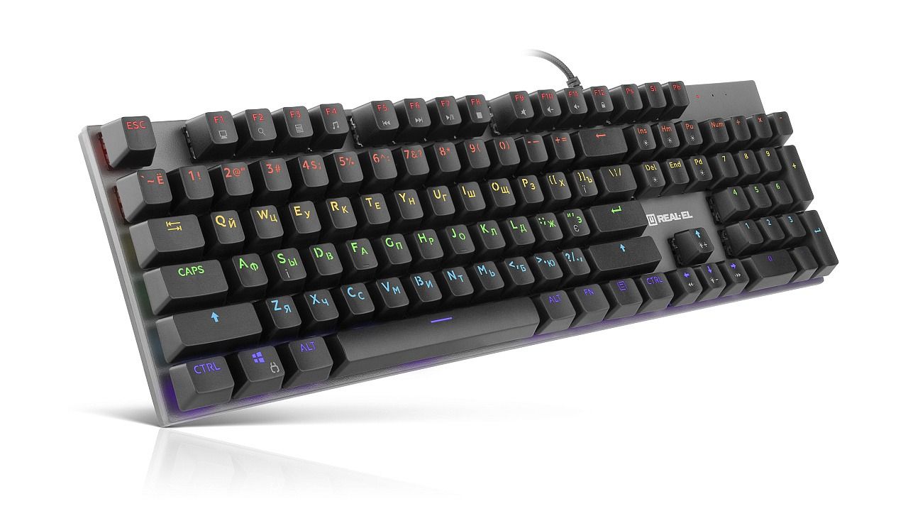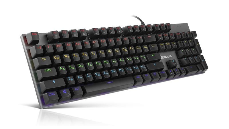 Висока надійність, швидкий час реагування, необмежена кількість одночасних натискань клавіш відрізняють механічну ігрову клавіатуру REAL-EL M 13. Дана модель обладнана різнокольоровим підсвічуванням з різноманітними комбінаціями, в кожній комбінації по 4 види підсвічування, які змінюються при повторному натисканні відповідної комбінації. Усього 20 видів підсвічування, що дозволяє створити на ігровому місці як агресивне середовище для онлайн-шутерів, так і атмосферу зосередження та концентрації для квестів та стратегій.