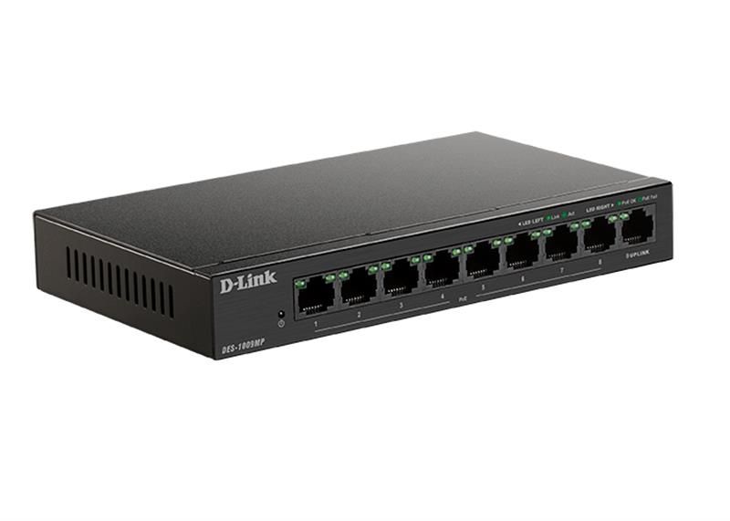 Некерований комутатор DES-1009MP оснащений 1 портом 10/100/1000Base-T та 8 портами 10/100Base-TX з підтримкою PoE. Комутатор DES-1009MP забезпечує просте підключення та подачу живлення на різні PoE-сумісні пристрої, такі як бездротові точки доступу та мережеві камери. Цей комутатор оснащений пасивним системним охолодженням, що забезпечує безшумну роботу пристрою.