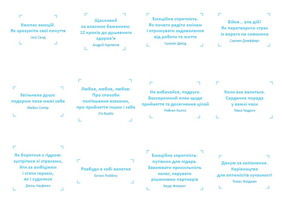 До кожної збірки увійшло 12 самарі визнаних міжнародних бестселерів: