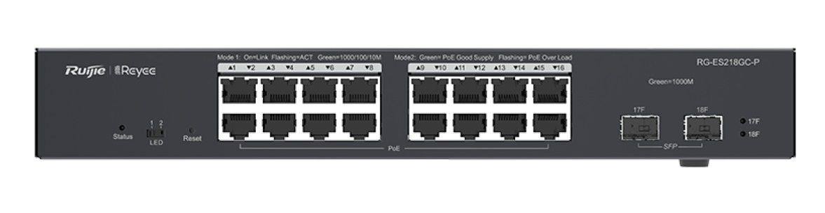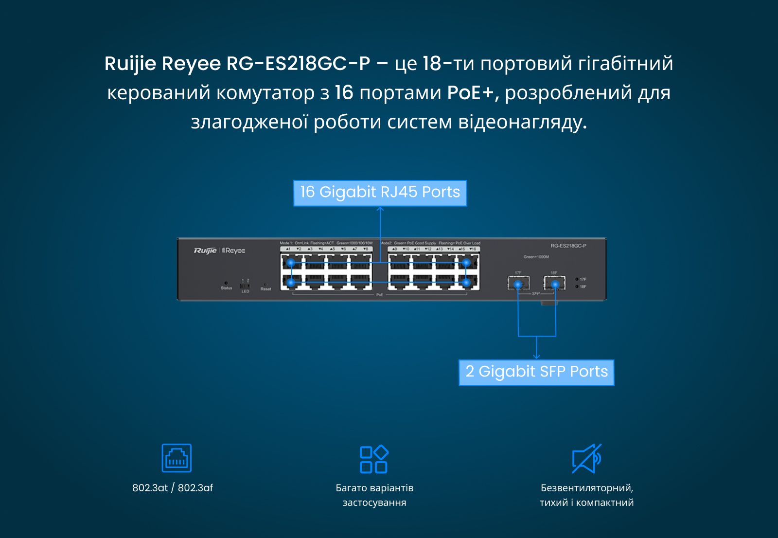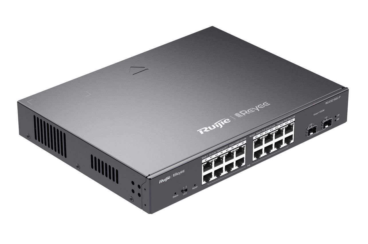 Ruijie Reyee RG-ES218GC-P – це 18-ти портовий гігабітний керований комутатор з 16-ма портами PoE+, розроблений для злагодженої роботи систем відеонагляду.