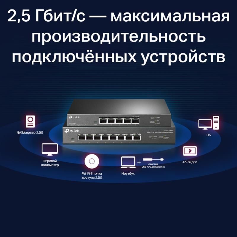 Настільний комутатор TL-SG105-M2 з 5 портами 2,5 Гбіт/с - це передовий комутатор, що забезпечує надійні надшвидкісні підключення з мінімальною затримкою і позбавляє необхідності використовувати кабелі категорії 6. Автоузгодження швидкості (100 Мбіт/с / 1 Гбіт/с / 2,5 Гбіт/с) і вісім портів 2,5 Гбіт/с забезпечать максимальну продуктивність для підключених пристроїв і комутаційну ємність 25 Гбіт/с.