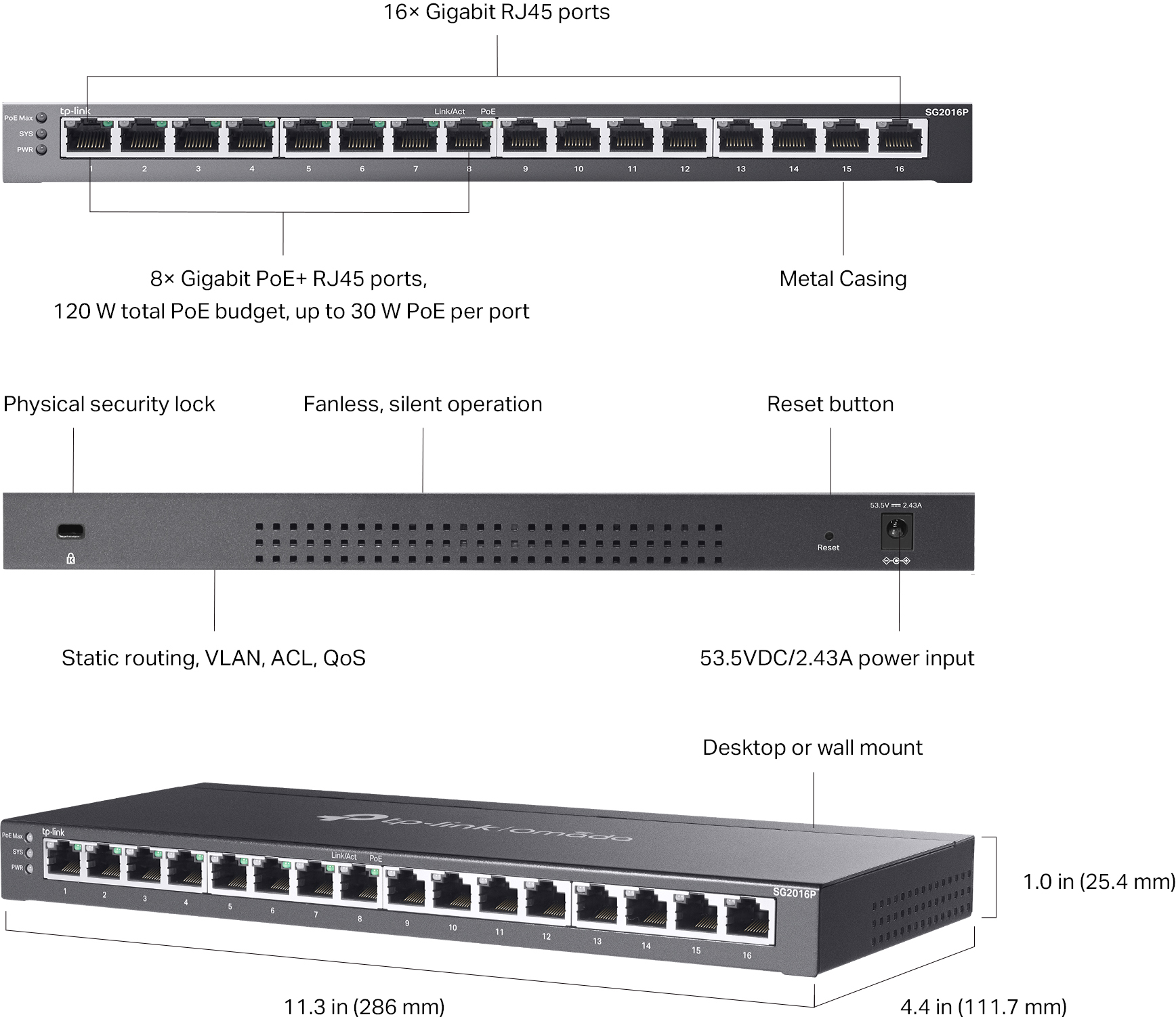 До TL-SG2016P можна підключати як пристрої з підтримкою PoE (IP-камери, точки доступу, IP-телефони), так і пристрої без підтримки PoE (комп’ютери, принтери, IPTV).