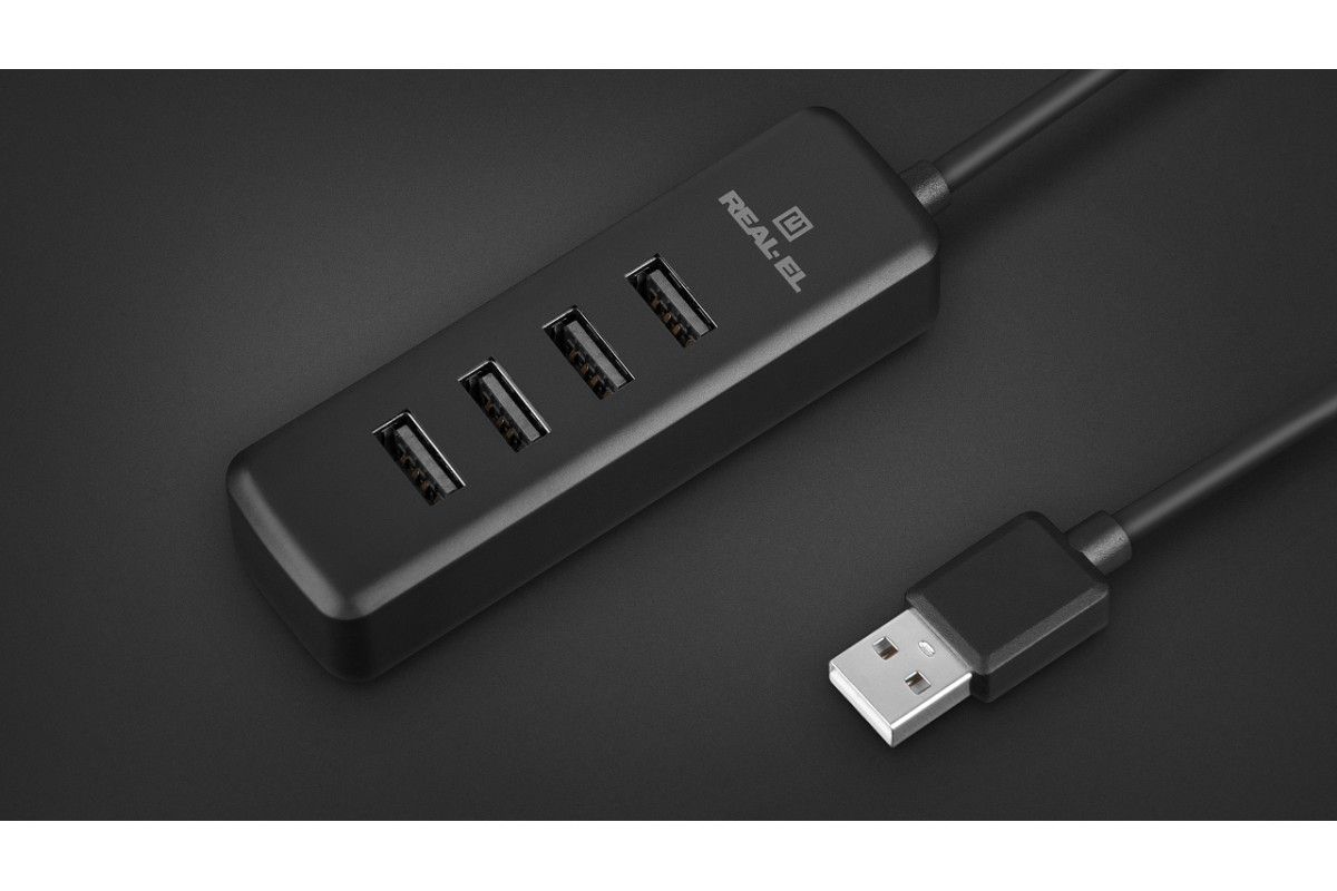 Довжина кабелю становить 1,2 метра, що забезпечує зручність підключення у будь-яких випадках. REAL-EL HQ-175 оснащений чотирма портами USB 2.0, що дозволяють підключати кілька пристроїв одночасно забезпечуючи швидкість передачі даних до 480 Мбіт/с.