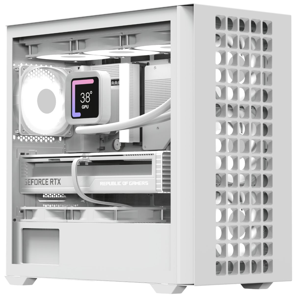 Корпус підтримує материнські плати ASUS і MSI MicroATX із зворотними роз’ємами. Ідеально підходить для потужних конфігурацій, підтримує рідинне охолодження довжиною до 360 мм і графічні процесори довжиною до 410 мм.
