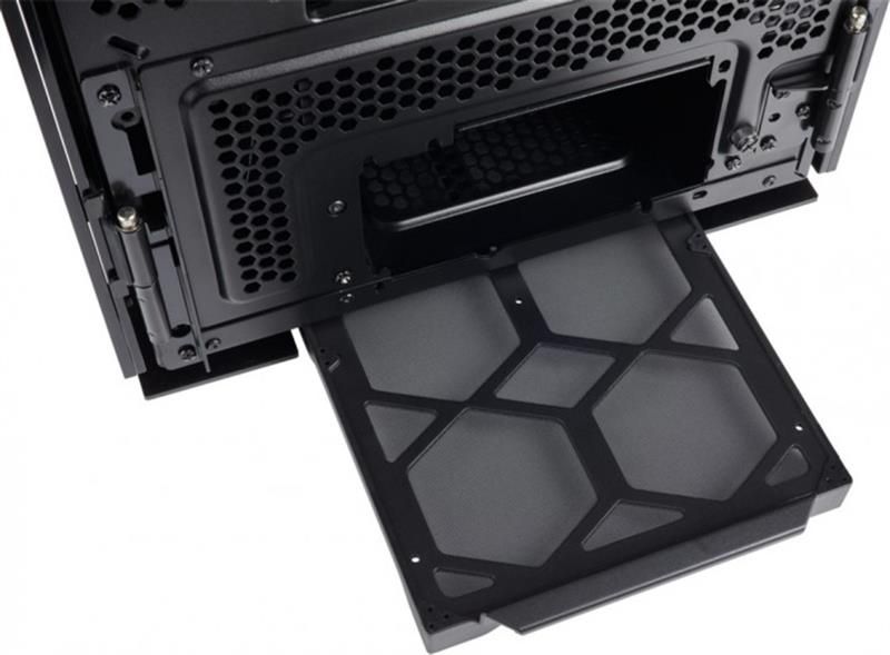 Підтримка зібраної на основі ПК 1000D системи в акуратному стані не зажадає від вас значних зусиль: в конструкцію входить скляна профільна дверцята для заднього відсіку, лоток для материнської плати E-ATX і лоток подвійного призначення, який підтримує материнську плату Mini-ITX і служить кришкою для блоку живлення.