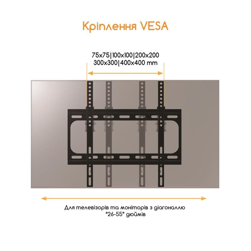 Стандарти VESA:75х75 мм, 100х100 мм, 200х200 мм, 200х300 мм, 300x300 мм, 400x300 мм, 400x400 мм
