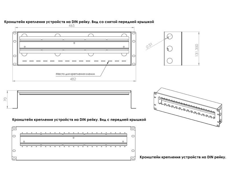 Кронштейн для кріплення обладнання DIN-стандарту: блоків, термостатів, автоматів і т.п. Дозволяє встановити 23 пристроя на DIN-рейку. Також допомагає зручно прокласти кабель, встановити заземлення клеми. Кронштейн сумісний з усіма видами 19" шаф і стійок. Для установки вимагаєте 4 комплекти кріплення.