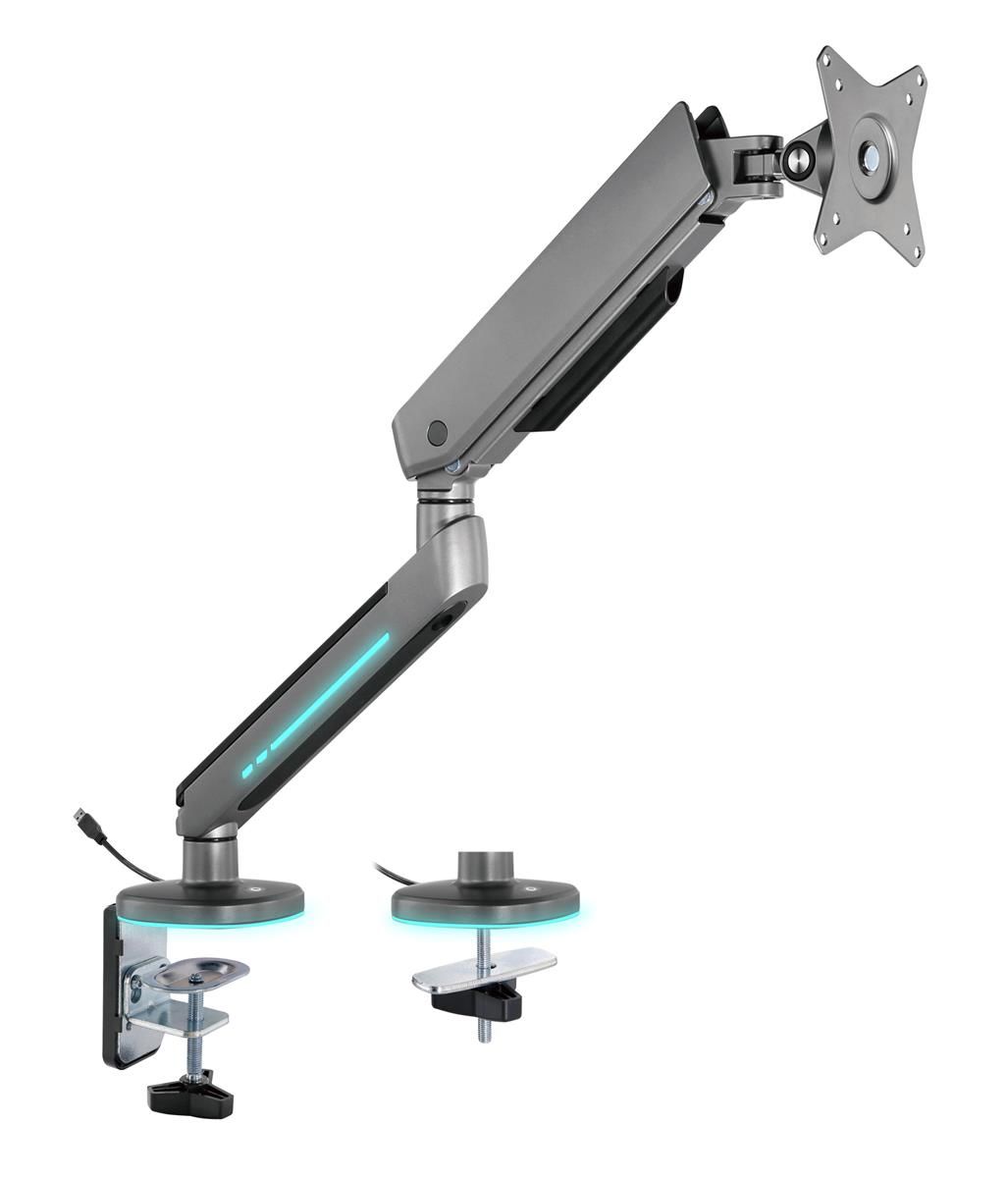 Настільне кріплення для моніторів Officepro MA901G plus RGB поєднує в собі потужність та функціональність, підтримуючи екрани діагоналлю від 17 до 32 дюймів із максимальною вагою до 9 кг. Вона має широкий діапазон налаштувань нахилу та обертання, що дозволяє користувачам адаптувати її під свої потреби. А завдяки яскравому RGB-підсвічуванню, що регулюється сенсорною кнопкою на основі кріплення, ви завжди зможете підкреслити дизайн свого ігрового або офісного місця.