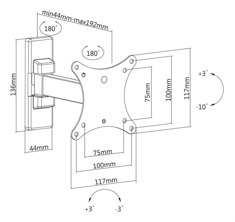 Дане кріплення призначене для настінної установки телевізорів або моніторів з розмірами екранів від 13" до 32" і стандартом кріплення VESA min 75x75, max 100x100.