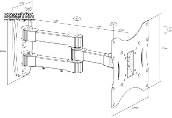 Настінний кронштейн для РК / плазмових телевізорів з можливістю повороту на 180 ° (до 90 ° в кожну сторону в залежності від діагоналі ТВ) і нахилу до 15 ° вниз / вгору.