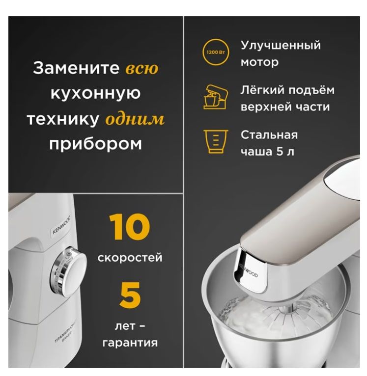 Кухонна машина Kenwood KVC 65.001 WH Titanium Chef Baker з перших же хвилин знайомства притягує до себе увагу. І це не дивно, адже настільки здавалося б вже буденна техніка для нас, може бути компактною, високопродуктивною і просто приємною на вигляд. Створена дана машина виключно з міцних матеріалів, а основа корпусу - високоякісний метал, який витримує всі процеси приладу і не деформується. Повертаючись до розміру, кухонна машина має маленькі габарити, що дозволяє розмістити її в будь-якому зручному для вас куточку кухні.