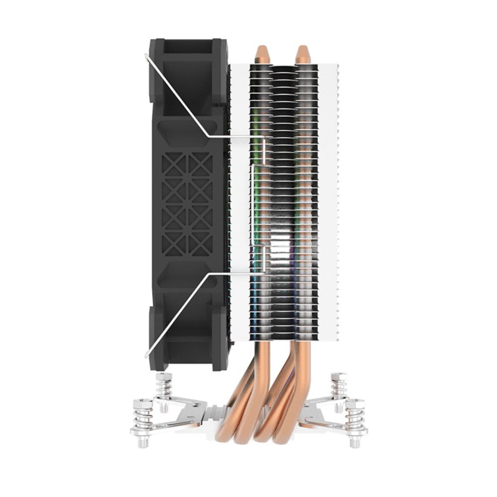 Трубки з чистої міді 4x6 мм і вакуумні теплові трубки можуть підключатися безпосередньо до процесора. Таким чином, тепло може швидко передаватися до плавників без будь-яких перешкод. Ребра цього процесорного охолоджувача FRGB використовують технологію згинання, яка сприяє гарній вентиляції та теплопровідності між ребрами.