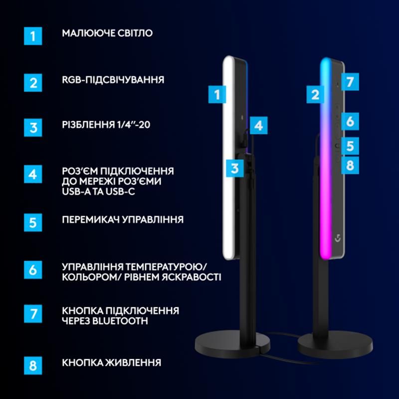 Підключайтеся через Bluetooth або USB для повного контролю над світлом та синхронізації RGB з іншим обладнанням Logitech G LIGHTSYNC, таким як миша, клавіатура, мікрофон, навушники та аудіосистеми.