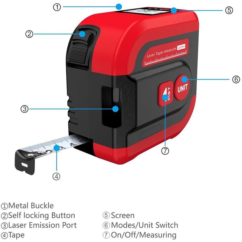 Лазерна рулетка поєднує 40-метровий лазерний вимірювач і 5-метрову рулетку.