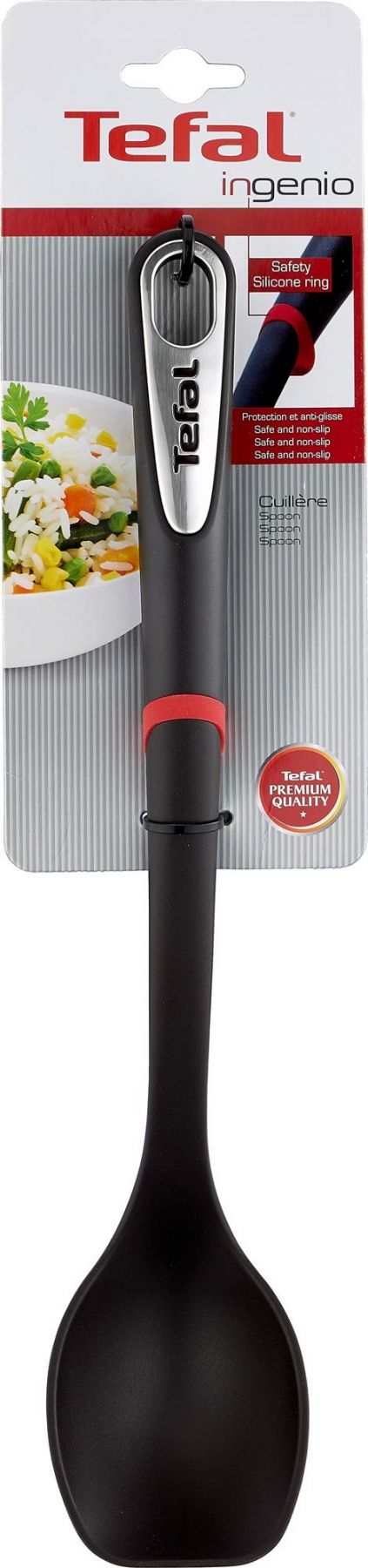 Ложка Tefal Ingenio виготовлена з міцного пластику. Підходить для використання з посудом з антипригарним покриттям. Силіконове кільце не дає ложці зісковзнути в каструлю і запобігає нагрів ручки. Плоска передня частина гарантує зручність захоплення продуктів.