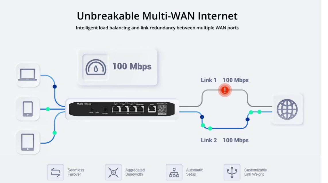 Роутер Ruijie Reyee RG-EG105G-P V3 є високопродуктивним рішенням для використання в домашніх умовах, яке дозволяє зручно і швидко підключити кілька пристроїв до Інтернету. Одна з ключових особливостей цієї моделі — максимальна швидкість WAN до 1 Гбіт/с, що забезпечує стабільне та швидке інтернет-з'єднання, яке підходить для потокової передачі відео, онлайн-ігор та роботи з хмарними сервісами. Крім того, в роутері передбачено чотири порти RJ-45 LAN з такою ж швидкістю, що дозволяє підключати різні пристрої безпосередньо.