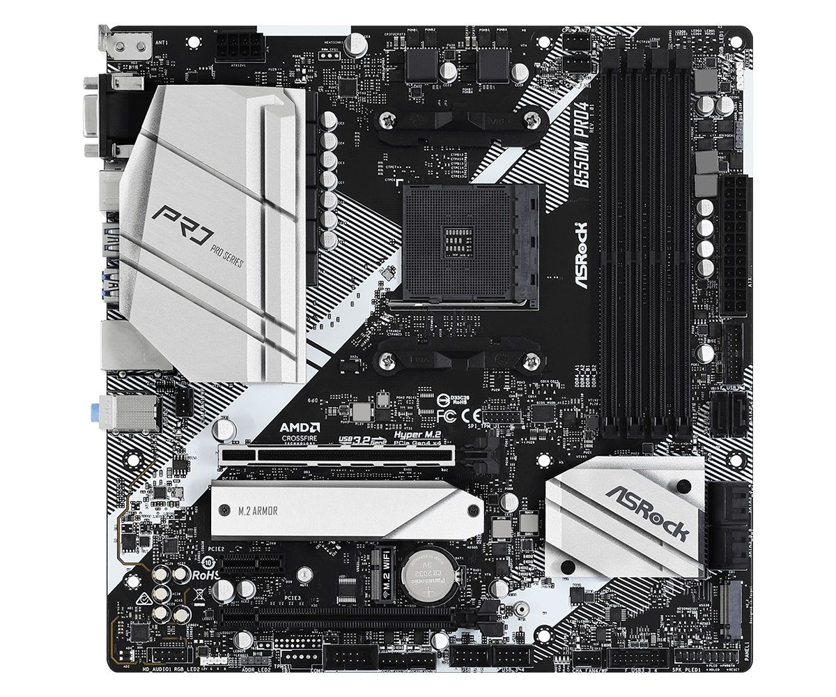Материнська плата ASRock B550M_PRO4. Складається з надійних компонентів і забезпечує рівномірне живлення ЦП. Також відкриває найширші можливості для розгону і підвищує продуктивність в іграх за рахунок підтримки низьких температур.