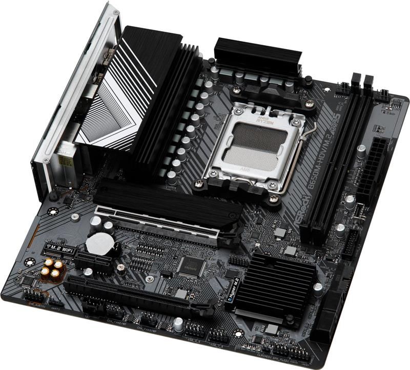 B650M-HDV/M.2 - материнська плата для процесорів AMD Socket AM5 Ryzen серії 7000 з фазою живлення 8+2+1, підтримкою DDR5 6400+ МГц (OC), інтегрованою графікою AMD RDNA 2 і мережею Dragon 2.5G.