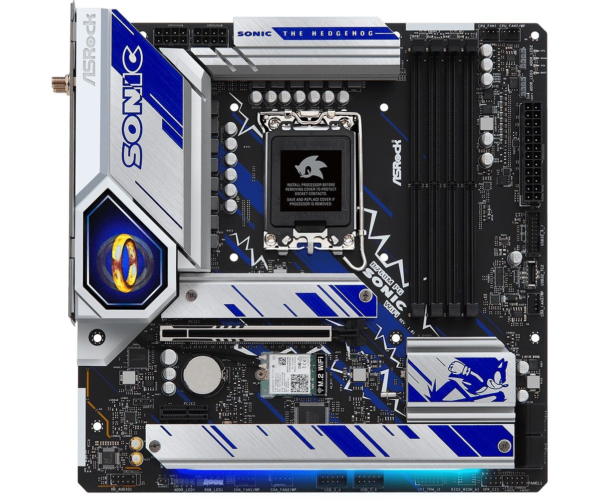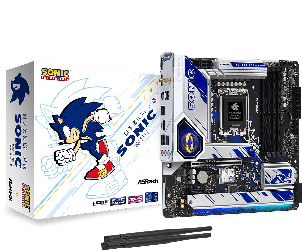 ASRock B760M PG SONIC WiFi – це ліцензійна материнська плата за ігровим всесвітом Sonic The Hedgehog. На кришці роз’ємів красується 16-бітове кільце, а на задній стороні зображений Сонік, що біжить. Випуск цієї материнської плати присвячений виходу гри Sonic Frontiers від SEGA.