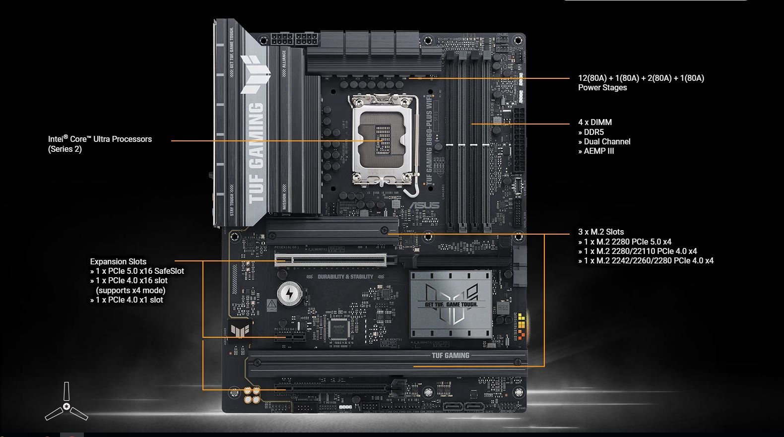 ASUS TUF GAMING B860-PLUS WIFI - це всі основні елементи новітніх процесорів Intel Core Ultra (Series 2), які поєднуються з ігровими можливостями та перевіреною часом надійністю. Ця материнська плата, оснащена компонентами військового класу, модернізованим рішенням живлення і комплексною системою охолодження, перевершує всі очікування, забезпечуючи надійну і стабільну продуктивність для марафонських ігор. Материнські плати TUF GAMING також проходять суворі випробування на витривалість, щоб гарантувати, що вони зможуть впоратися з умовами, в яких інші можуть вийти з ладу. Ця платформа забезпечує потужність і можливості під'єднання, які потрібні передовим застосункам для ПК зі штучним інтелектом.