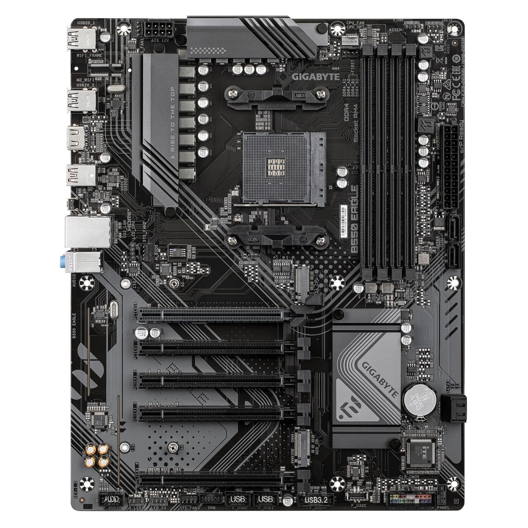 Gigabyte B550 EAGLE — материнська плата формфактора ATX, призначена для встановлення процесорів AMD, які сумісні із сокетом B550. Підтримує оперативну пам’ять DDR4, для планок передбачено 4 слоти з можливістю встановлення до 128 ГБ. Має всі необхідні роз’єми для встановлення накопичувачів швидкісного типу, відеопорти для підключення мультимедійних пристроїв.