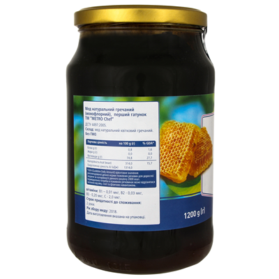 Мед Chef натуральний гречаний 1.2кг. Склад: мед натуральний квітковий гречаний. Рік збору меду: 2018р. Калорійність на 100г продукту: 1314 кДж (314 ккал). Поживна цінність на 100г продукту: білки - 0.8г, жири - 0г, вуглеводи - 74.8г. Умови зберігання: зберігати у приміщеннях, захищених від прямих сонячних променів за температури не більше ніж +25°С. Не дозволено зберігати мед разом з отрутами та продуктами, що надають нехарактерний для нього запах. Строк придатності: 2 роки з дати виготовлення. Країна виробник: Україна. Маса нетто: 1.2кг.