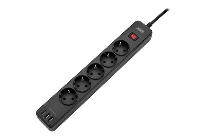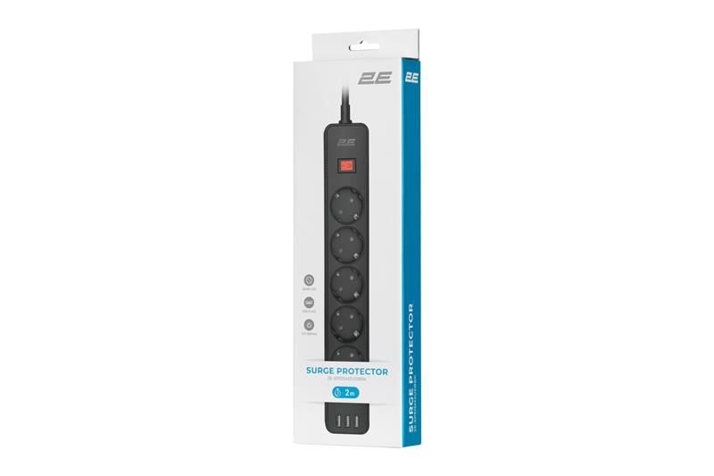 Мережевий фільтр 2E має п’ять розеток, розташованих під кутом 45°, щоби вилки пристроїв не заважали одна одній. Для заряджання мобільних пристроїв передбачено три розніми USB-A: 2 x 5 В, 3,4 A; 1 x 5 В, 2,4 A. Корпус виготовлений з вогнетривкого PC-пластику, що забезпечує високу термостійкість та запобігає виникненню пожежі. У кабелі мережевого фільтра ізольована кожна жила: трижильний H05VV-F із перерізом 1,5 мм. Матеріал провідника – 100 % мідь. Саме ці особливості зумовлюють допустиме максимальне навантаження на пристрій 3 680 Вт. Максимальна поглинаюча енергія фільтра становить 350 Дж.