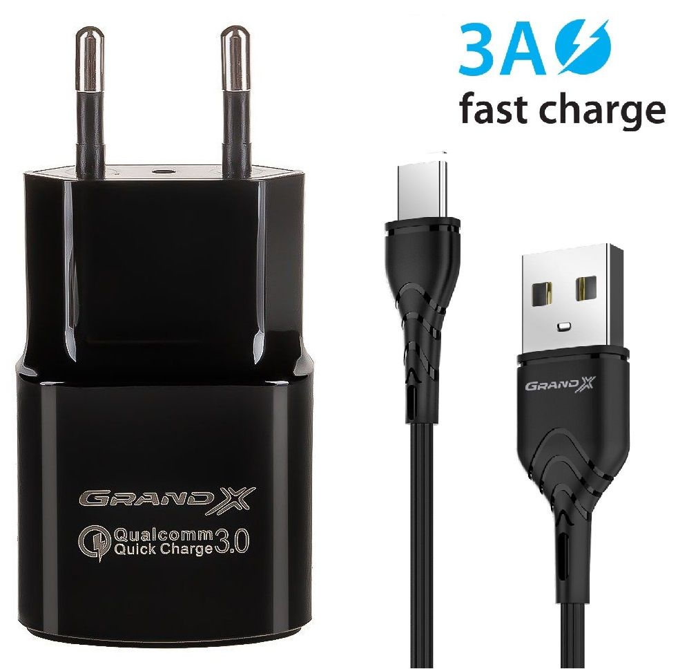 Мережевий зарядний пристрій Grand-X (1USBx3А) QC3.0 Black (CH-550TC) + кабель USB-C