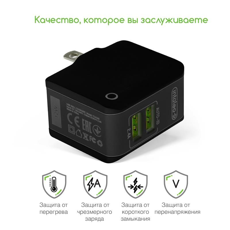Мережевий зарядний пристрій підвищеної потужності Intaleo TCA242 двома виходами USB і інтелектуальним керуванням харчування AUTO-ID