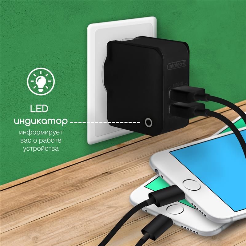 Технологія AUTO-ID: Тепер не потрібно підбирати зарядний пристрій по параметрам Вашого смартфона. Зарядний пристрій Intaleo TCA242 автоматично визначає тип підключеного пристрою. Це дозволяє вибрати оптимальний режим подачі живлення і отримати максимальну швидкість зарядки.