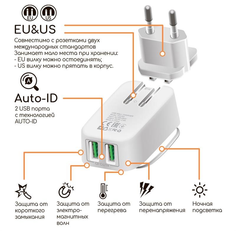 Технологія AUTO-ID: тепер не потрібно підбирати зарядний пристрій відповідно до параметрів вашого смартфона. Зарядний пристрій Intaleo TCL242 автоматично визначає тип під’єднаного пристрою. Це дає змогу вибрати оптимальний режим подання живлення й отримати максимальну швидкість заряджання.